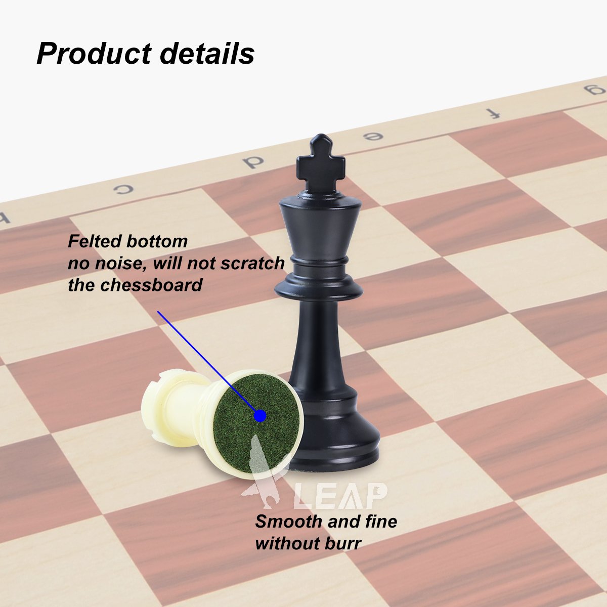King = 3" tall, 1 2/5'' base Ideal size for quick analysis or classroom desks Solid plastic quality construction Complete set of 32 chess pieces