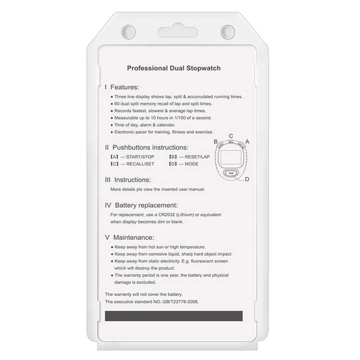 Specification and parameters 1.Lap and split timing options 2.3 row display 60 lap dual split recallable memory 1.Display of fastest (FS), slowest (SL) and average (AV) lap times 3.Continuous display of event time 4.Memory recall after reset and during operation 5.1/100 second precision to 10 hours 6.12/24 hours time format 7.Lap counter(60 memory:0~60) 8.Presentable countdown timer 9.Pacer function 10.Time and calendar, Alarm and Chime 11.OEM & ODM Services Offered 12.Lithium battery CR2032 13.Back Clip and Lanyard Included 14.1 year warranty 15.Size: 78*59*20mm 16.N.W.:50.0g 17.G.W.:90.0g 18.Packing info.: 250pcs/carton,total:22.5 KG, size:50*38*43cm
