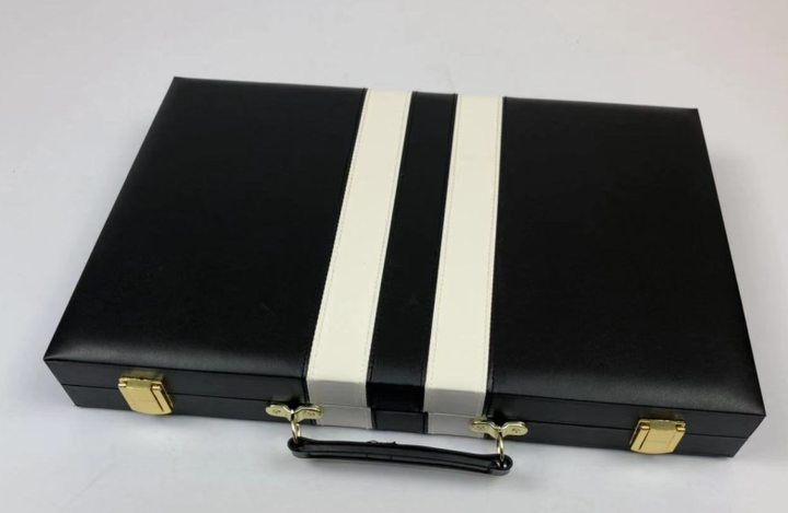 Black and white chess pieces, 5 dice, 2 dice cups and other accessories